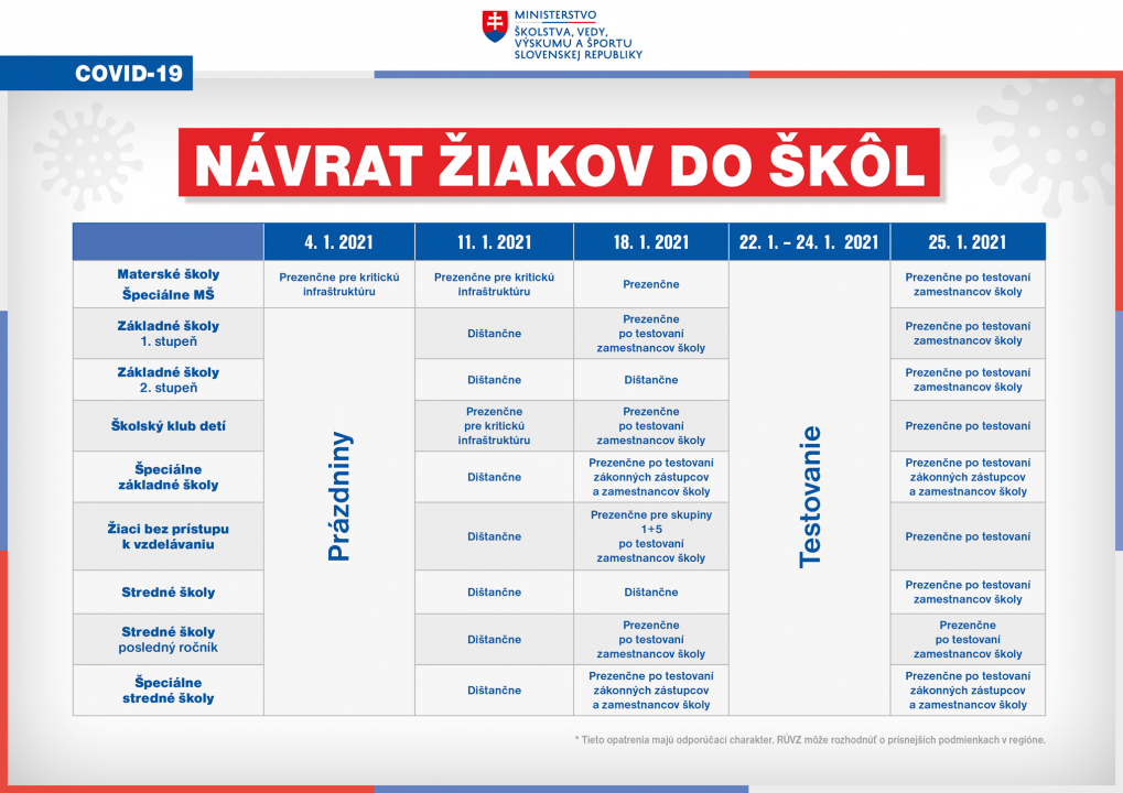 A terv szerint a helyzet január 18-tól így nézhet ki: nyitva lesznek az óvodák, és folytatódik az általános iskolák és a speciális iskolák első szakaszának tanítási folyamata. Az Oktatási minisztérium javasolja a szülők és az alkalmazottak tesztelését. A szülők még mindig 5 egymást követő tanítási napon igazolhatják a gyermek távolmaradását. Szükség esetén a tanuló otthon maradhat a kijárási korlátozás végéig. Az általános iskolák és a középiskolák felső évfolyamai távoktatásban vesznek részt. A középiskolák végzős évfolyamai is megnyithatók, feltéve, hogy az iskola tanulóit és alkalmazottait letesztelik, az ÚVZ SR vonatkozó rendeletének megfelelően.