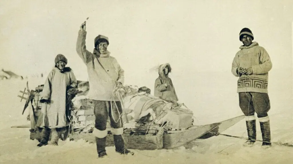 Knud Rasmussen expedícióvezető egy expedíciós szánnál az expedíció tagjaival, Arnarunnluaqkal és Qaavigarsuaqkal, valamint egy ismeretlen személlyel. Az 5. Thule-expedíció fotója © Dán Nemzeti Múzeum.