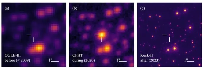 A vizsgált exobolygórendszer képe három különböző műszerrel. (Forrás: OGLE, CFHT, Keck Observatory.)