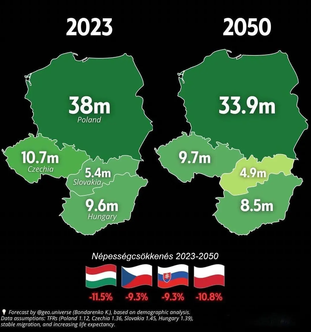 A Visegrádi Négyek (V4: Magyarország, Lengyelország, Szlovákia, Csehország) előrejelzései szerint 2050-re a népesség csökkenése országonként eltérő, de jellemzően jelentős: