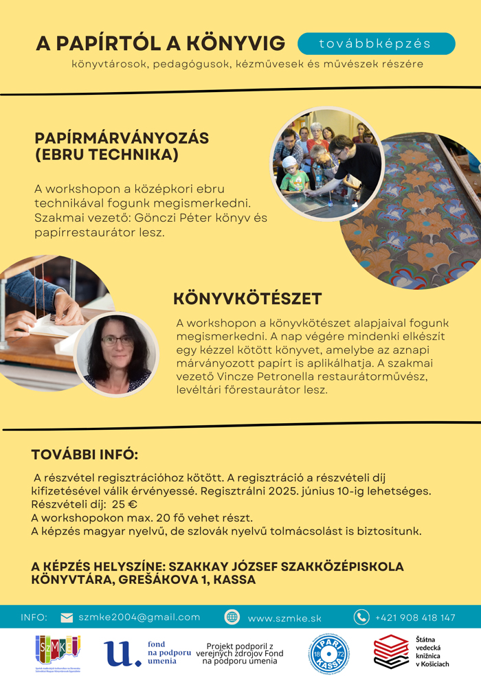 A Szlovákiai Magyar Könyvtárosok Egyesülete lehetőséget kínál érdeklődő kézművesek, könyvtárosok, pedagógusok, művészek számára: 2025. június 16-án tartja A papírtól a könyvig c. szakmai workshopját Kassán, a Szakkay József Szakközépiskolában (8-tól 16 óráig).